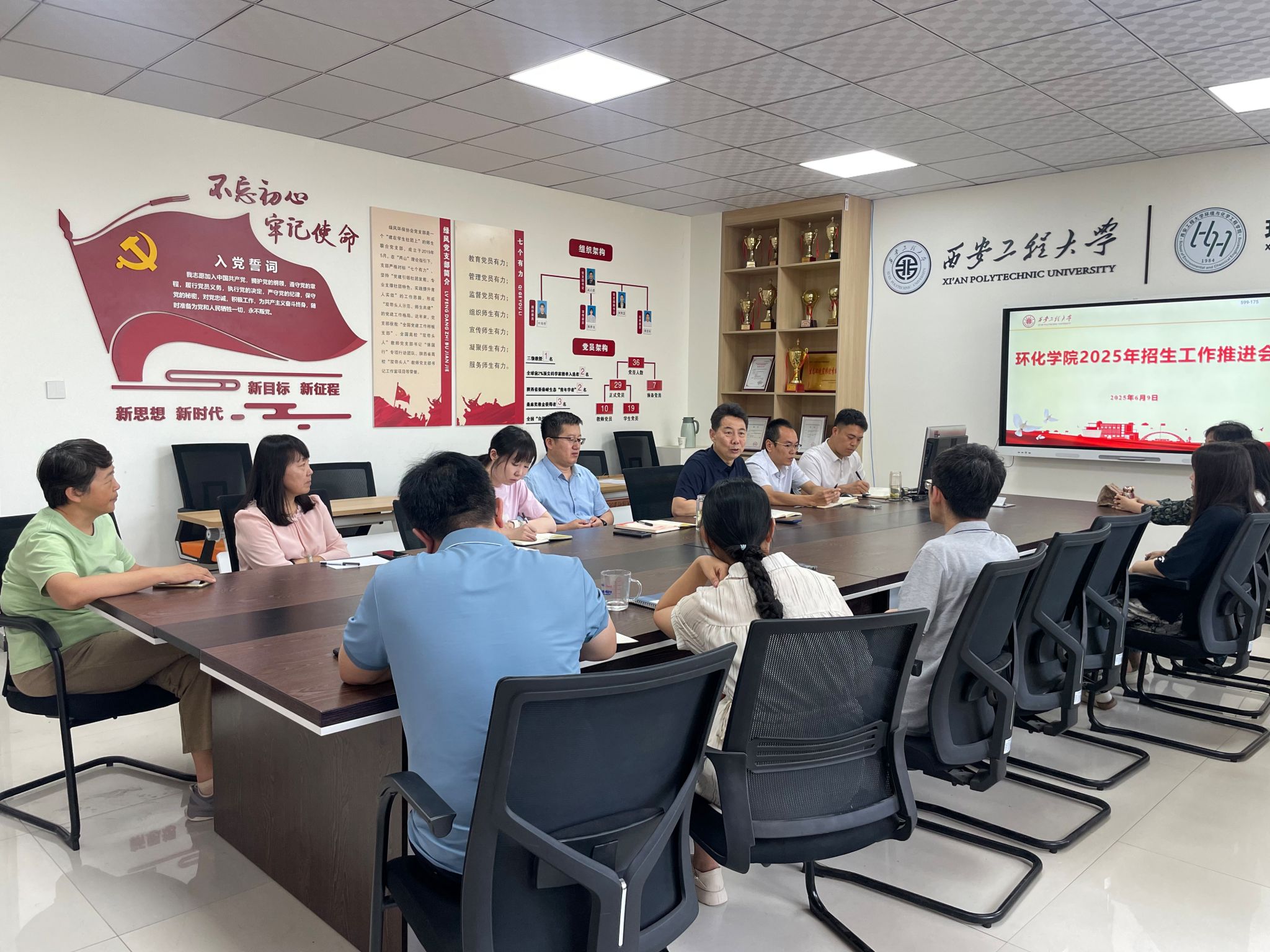 今年是陕西省新高考改革元年,为切实提升2025年本科生源质量,在学校统筹部署下,环化学院党委高度重视,带领全院教职工积极谋划,认真部署,广泛动员,组建了一支有热情、有能力的招生工作队伍。6月9日,环化学院召开本年度招生工作部署会,学院党委书记胡西民传达学校精神,部署学院行动,与会教师认真学习新高考政策,深刻分析学院在今年招生工作中的困难和机遇,结合前期工作基础,明确了学院2025年招生工作重点,制定了“时间表”和“任务书”,确保工作有重心,行动有方向。在6月13日全院教职工大会上,党委书记胡西民强调要珍惜招名前宝贵的宣传时间,加大加强宣传力度,全院上下都是宣传员,利用好自己的社交平台,积极转发学校的招生宣传材料,服务好考生报考,努力把第一次新高考的基准线提高,为高质量办学打下良好的基础。