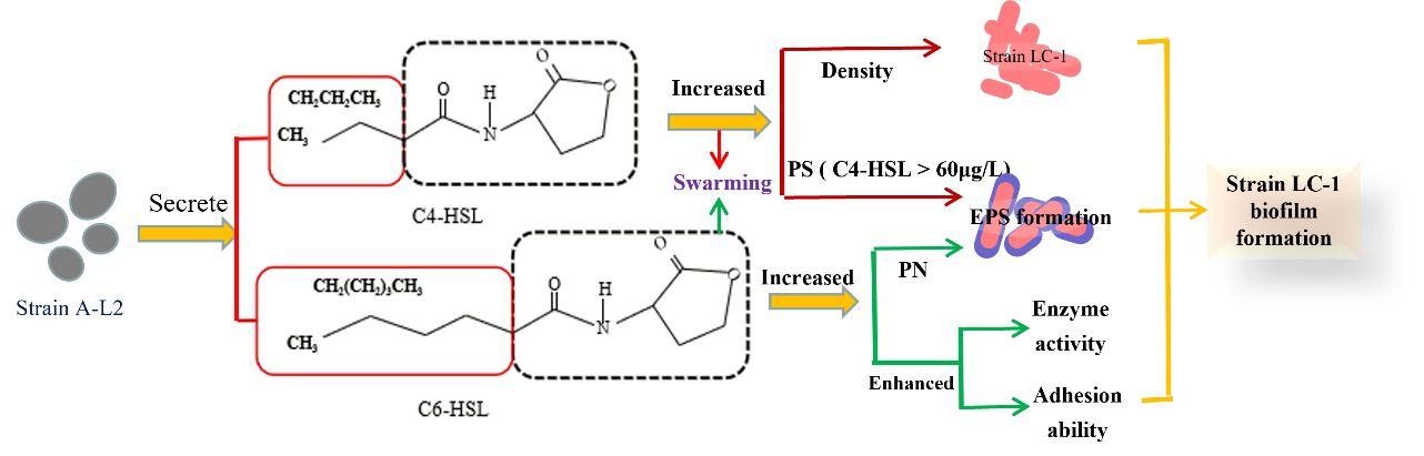 喹啉是煤化工废水中难降解的有机物之一,影响到生态环境与人类健康。目前,已经有许多技术用于降解喹啉研究,但利用群体感应现象协同降解喹啉的研究还未深入。因此本研究重点从群体感应信号分子强化生物膜形成的角度入手,协同信号分子分泌菌株对喹啉降解进行深入研究,结果表明:菌株A-L2主要分泌C4-HSL与C6-HSL两种信号分子,它们在喹啉降解过程中通过促进生物被膜过程展现出高效的生物强化作用。两种信号分子均可提高菌株LC-1的群游能力,其中C4-HSL可提高菌株LC-1生物量,刺激胞外多糖分泌;C6-HSL可诱导菌株LC-1黏附性能提升和胞外蛋白的分泌,二者共同强化了菌株LC-1的生物膜形成过程。该研究在煤化工废水生物降解过程中有一定的实际应用价值。