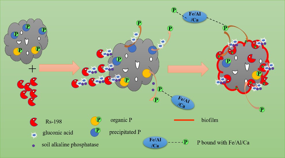 该研究合成的难溶性生物炭基磷肥(NBPF)含有水溶性磷、沉淀磷和有机磷。其粗糙的表面和微观水平的大孔隙为Rs-198提供了良好的栖息地,Rs-198很好的定殖在NBPF表面,并且NBPF中的高易碳含量和低自由基含量加速了Rs-198的定殖。Rs-198加速了NBPF中沉淀磷和有机磷的释放,并且Rs-198将释放在环境多余的磷储存在自己的体内,在周围环境处于磷饥饿的条件下将磷释放。揭示了土壤中的NBPF与Rs-198之间存在强的范德华吸引力和静电吸引力,因此,NBPF通过将Rs-198吸附到其表面,增加了土壤对Rs-198的固持作用。固定在NBPF表面的Rs-198可以通过电子传递作用,分泌葡萄糖酸和提升土壤的碱性磷酸酶来氧化、溶解和矿化NBPF中的有机磷和沉淀磷,进一步提升了NBPF中磷的有效性。鉴于以上Rs-198对NBPF磷的活化和储存性能,将Rs-198与NBPF共同施用,调控磷转化、释放及吸收,具有重要的应用前景。
