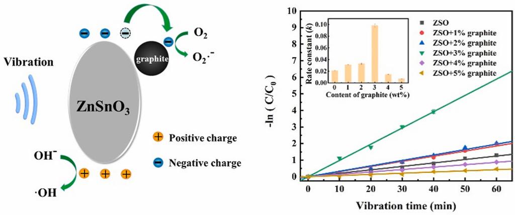 近日,我院武峥博士课题组在新型压催化降解染料废水方面再次取得新进展,相关成果发表在Ceramics International (49, 29614, 2023) (IF=5.2,中国科学院SCI一区)。题目为“Strongly enhanced piezoelectric-catalysis of ZnSnO3/graphite hybrid materials for dye wastewater decomposition”。武峥博士为第一作者,硕士生范保喜为第二作者。188改名taptap环化学院为第一单位。本工作中,通过溶胶凝胶法合成了压电锡酸锌纳米材料,并在其中混合一定比例的导电石墨,用于加速压电诱导的载流子的迁移,从而获得提高了的压催化性能。在混合石墨比例为3%时,压催化效果达到最优,对罗丹明B染料溶液的降解率达~100%,反应速率常数为~0.098 min-1,远高于纯锡酸锌催化剂对罗丹明B染料溶液的降解率~73%和反应速率常数~0.021 min-1。该压催化剂在纺织印染废水中处理中具有重要的应用前景。