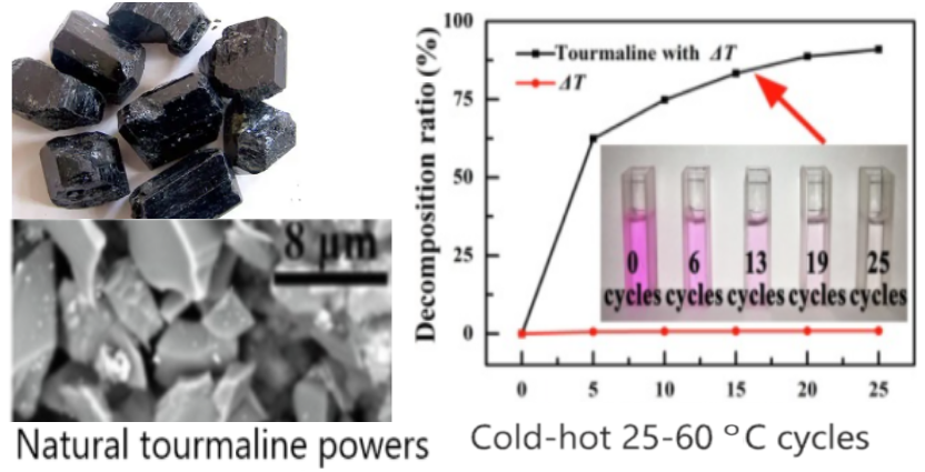 近期,我院武峥博士课题组在室温热催化方面取得新进展。实现了在室温冷热变换下利用天然矿物材料降解染料废水,相关研究成果以题目“Natural tourmaline for pyroelectric dye decomposition under 25–60 °C room-temperature cold-hot fluctuation”发表在环境领域著名期刊Separation and Purification Technology(327, 124971, 2023; IF=8.6)。武峥博士为第一作者,硕士生许涛声为第二作者。188改名taptap环化学院为第一单位。电气石(Tourmaline)是以含硼为特征的铝、钠、铁、镁、锂的环状结构天然硅酸盐矿物。电气石是一种天然的热释电材料。本工作中,武峥博士课题组采用天然电气石矿物粉末材料作为催化剂,在室温25-60摄氏度冷热循环激励下,经历25次冷热循环,罗丹明B染料的降解率可达84.7%左右。我国电气石资源丰富、分布范围广泛、矿产品质优良、价格便宜。本工作是国际上首次采用天然矿物作为室温热催化剂并用于染料废水降解方面的研究报道。未来有望利用廉价的天然电气石矿物材料实现在环境冷热变换(例如昼夜温差)激励下实现大规模的纺织印染废水处理。