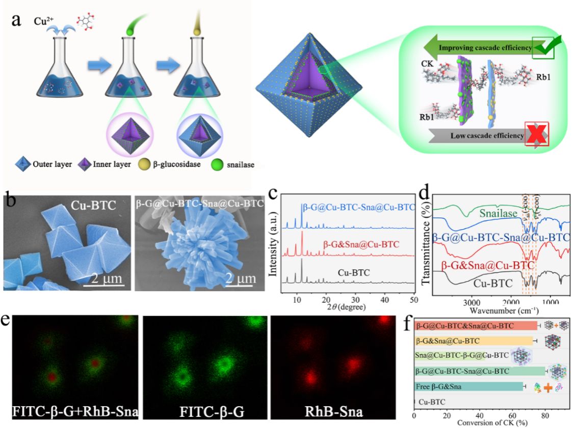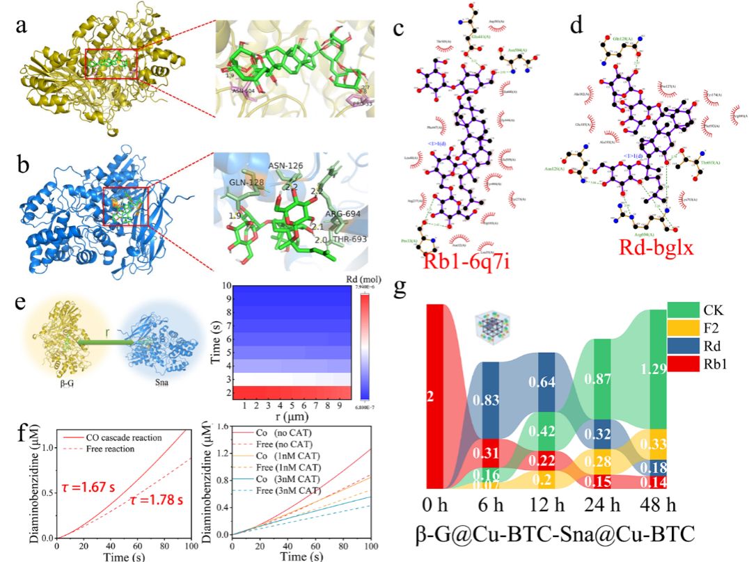 多酶级联催化被认为是解决稀有人参皂苷转化周期长、转化效率低的潜在方式,但其仍存在热稳定性差、无法重复利用的问题。提高多酶级联反应的稳定性是生物技术和化学领域的一项挑战。该研究通过分层自组装构建了一个多酶分区固定平台,实现MOF中多酶的按需固定。该策略被用于固定β-G和snailase以转化稀有人参皂苷CK,显示出惊人的稳定性和循环性能。通过建立底物扩散模型,研究了限域空间中底物在双酶间的传质行为,评价了分区固定化策略的底物通道效应。分子动力学模拟显示,在高温和有机溶剂中,MOFs能有效限制级联酶的构象变化,同时拥有更大的活性口袋,这允许更高效的底物与酶分子对接。随后以GOX和HRP为模型酶验证了MOF分区固定策略用于级联酶的普适性。