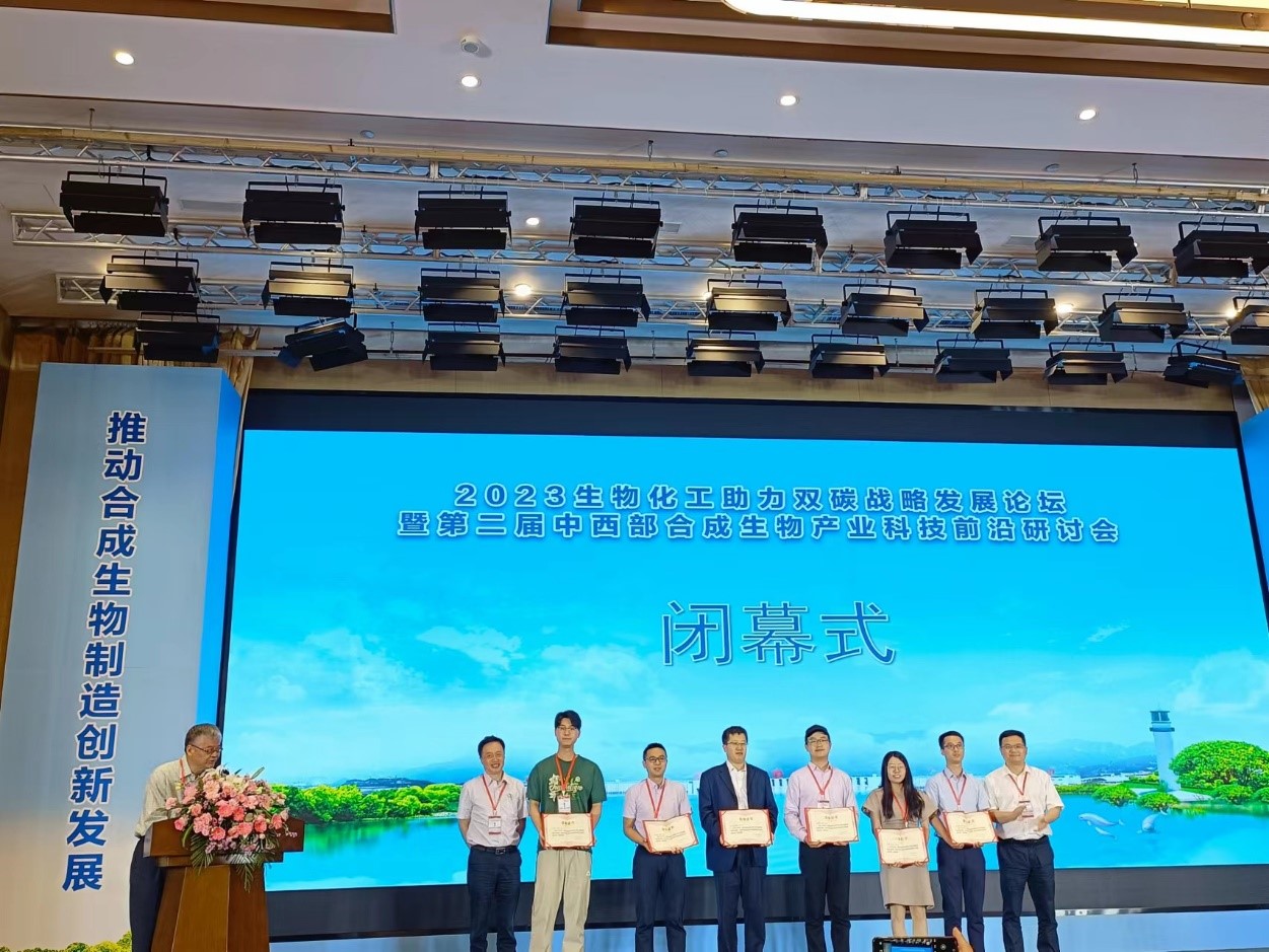 202362652023生物化工助力双碳战略发展论坛暨第二届中西部合成生物产业科技前沿研讨会在中国湖北宜昌猇亭区召开。我院武占省教授受邀参会,作为特邀专家在分论坛天然产物的生物制造中,作题为《金属有机框架固定化酶创制及其转化稀有人参皂苷研究》报告,并获得了优秀报告奖。