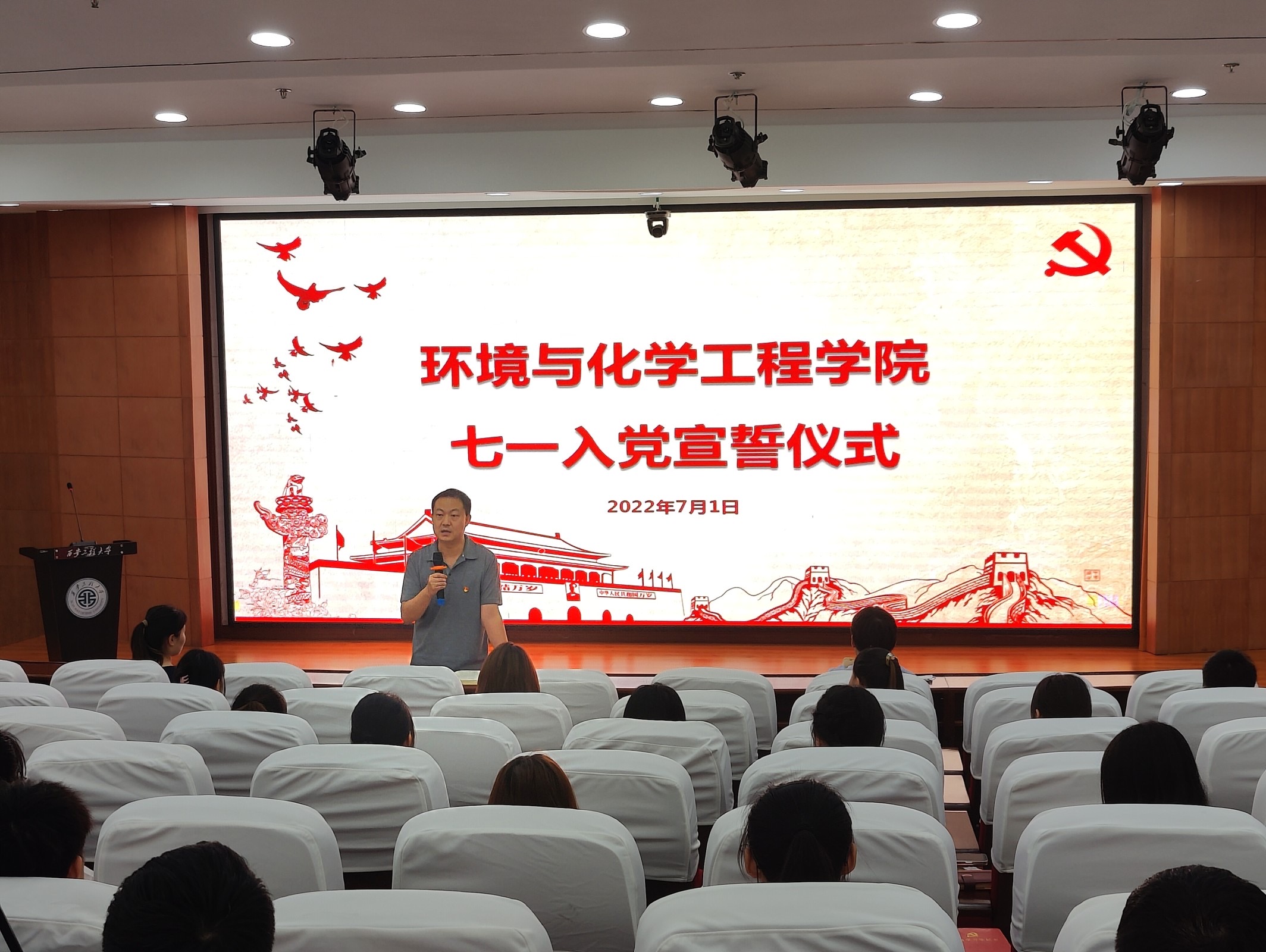为庆祝中国共产党成立101周年,2022年7月1日上午11时,环化学院在临潼校区图书馆一楼报告厅隆重举行“七一”入党宣誓仪式。学院党委副书记赖斌、全体辅导员和第62期新发展预备党员参加宣誓仪式。仪式由团总支书记贾天昱主持。