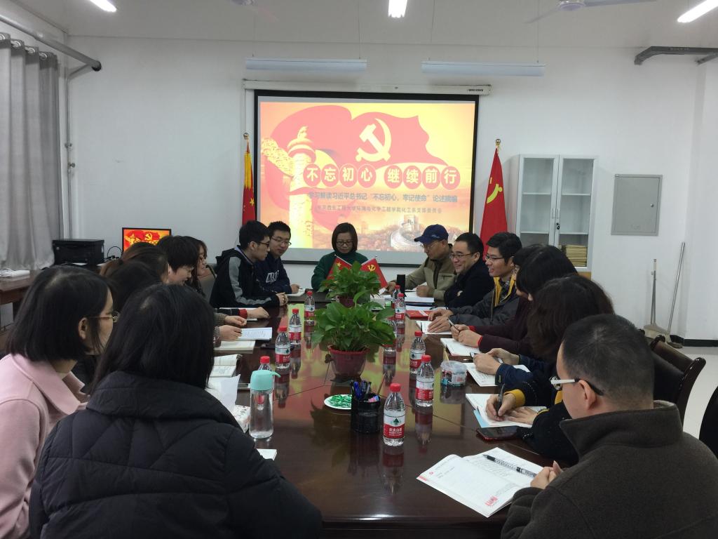 为了进一步扎实开展“不忘初心、牢记使命”系列主题教育,深刻学习理解习近平总书记“不忘初心、牢记使命”论述摘编,将思想政治教育与教学科研相结合,促进党建成果落到实处。2019年10月31日,环化学院化工系党支部全体党员于临潼校区学院楼506会议室进行了“不忘初心、继续前行”主题教育暨学术交流会。