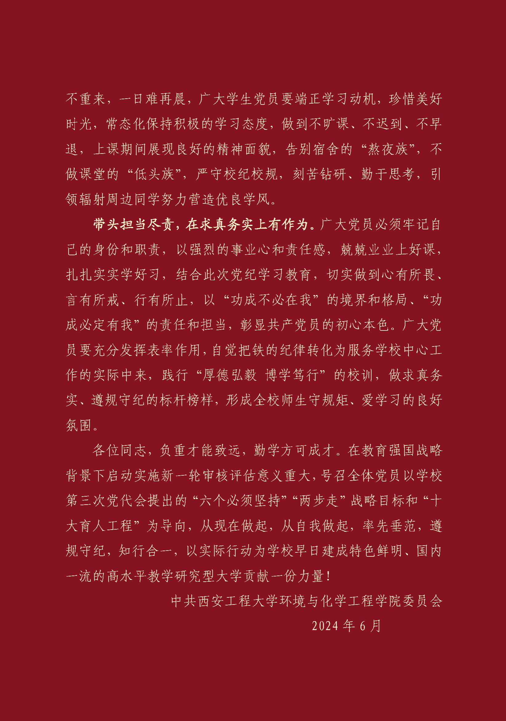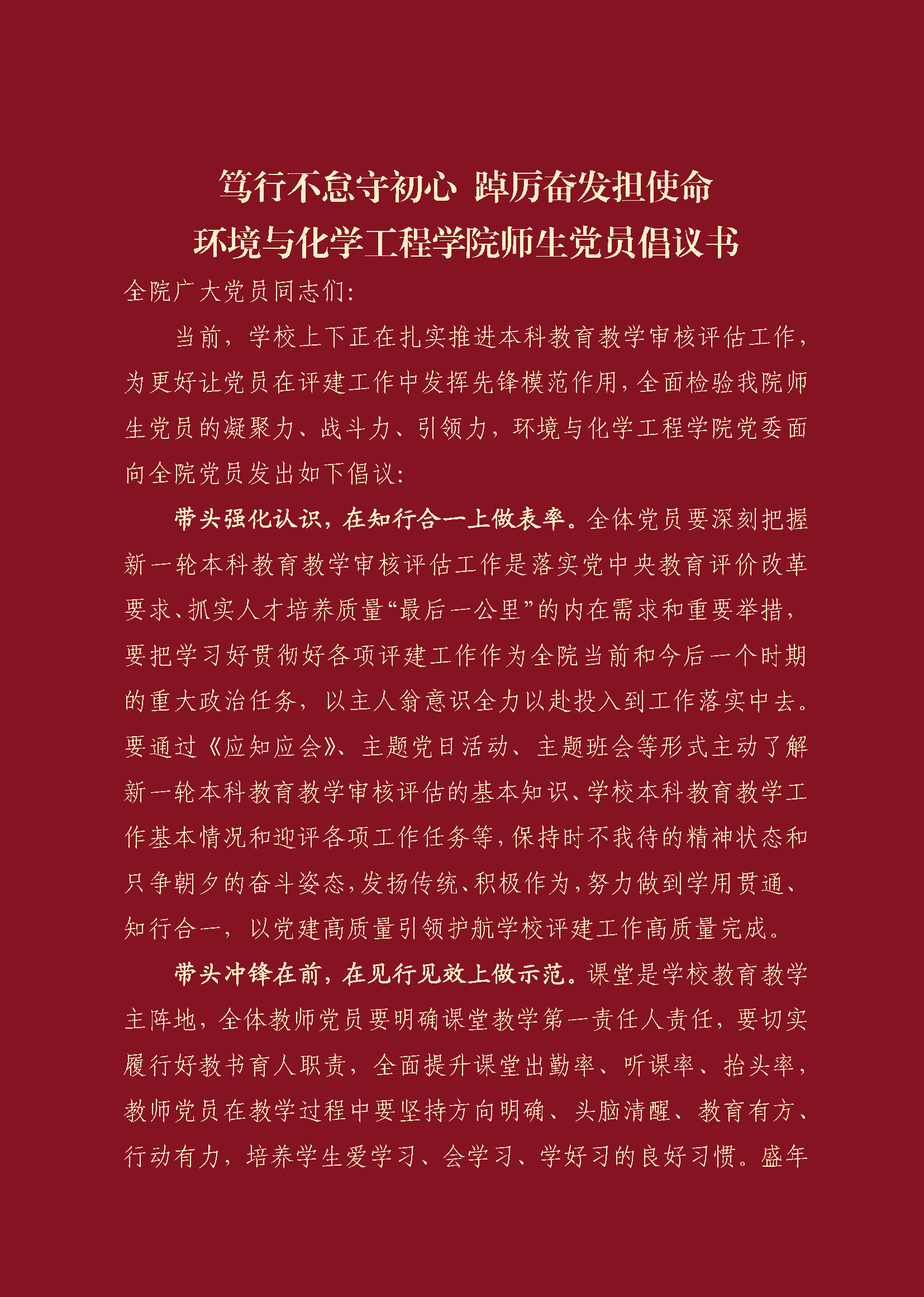 《倡议书》从“带头强化认识,在知行合一上做表率”“带头冲锋在前,在见行见效上做示范”“带头担当尽责,在求真务实上有作为”三方面对学院教师和学生发出倡议,围绕审核评估工作过程中,师生党员“做什么”“怎么做”“做成什么样”等问题提出要求。《倡议书》中提到,全体党员要把学习好贯彻好各项评建工作作为全院当前和今后一个时期的重大政治任务,以主人翁意识全力以赴投入到工作落实中去。广大教师要切实履行好教书育人职责,坚持方向明确、头脑清醒、教育有方、行动有力,培养学生爱学习、会学习、学好习的良好习惯。广大学生党员要端正学习动机,珍惜美好时光,展现良好的精神面貌,引领辐射周边同学努力营造优良学风。《倡议书》还要求广大党员要自觉把铁的纪律转化为服务学校中心工作的实际中来,践行“厚德弘毅 博学笃行”的校训,做求真务实、遵规守纪的标杆榜样,形成全校师生守规矩、爱学习的良好氛围。