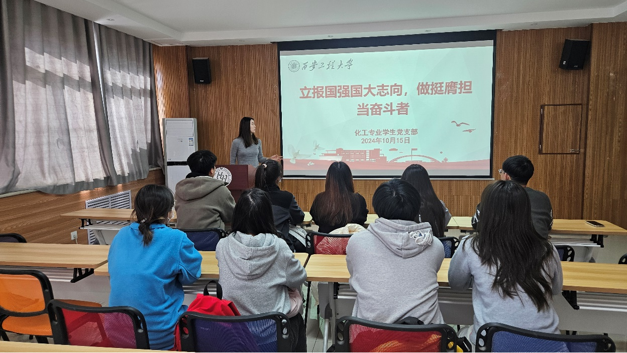 2024年10月15日,化工专业学生党支部在环化楼507举办了以“立报国强国大志向,做挺膺担当奋斗者”为主题的党日活动,支部全体党员参加,党支部书记盖潇宇主持。