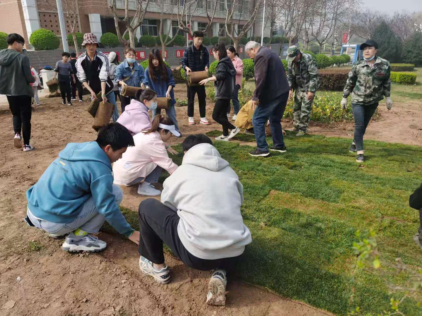 贾天昱首先为大家介绍了本次活动的具体流程、活动意义并强调同学们要听从指挥、注意安全;夏鲲首先感谢绿风环保协会长期以来对学校绿化工作的支持,并为同学们介绍了学校绿化工作的基本情况,绿化主管卫武锋老师为同学们演示植绿步骤及操作要领;最后所有人根据指导分区进行整理土地、草皮铺设等工作。活动持续近两个小时,大家收获颇丰,切实感受到劳动带来的美好体验。