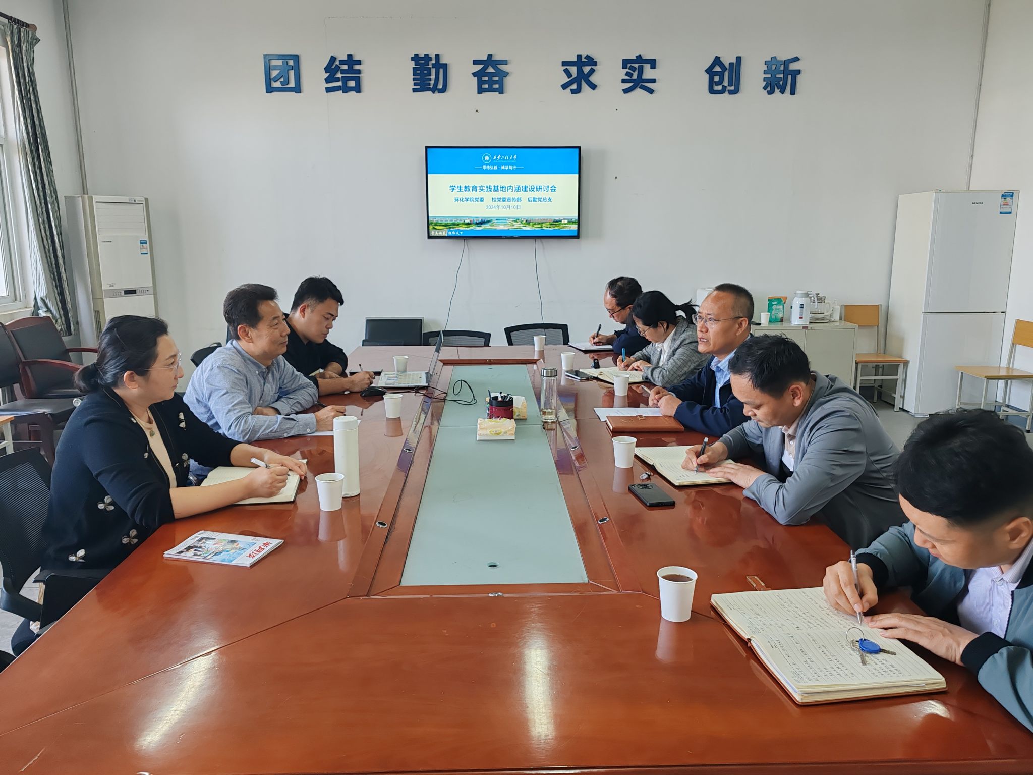 10月10日,党委宣传部、Taptap点点(188改名)党委、后勤管理处(集团)党总支围绕学习贯彻党的二十届三中全会精神、习近平生态文明思想和全国教育大会精神,重点就绿风环保协会生态文明教育基地和Taptap点点(188改名)产学研&劳动教育实践基地内涵建设交流研讨。Taptap点点(188改名)党委书记胡西民、党委宣传部副部长张琪,后勤管理处(集团)党总支书记杨森、处长张峰及班子成员,绿风环保协会指导教师贾天昱和后勤动力科郝佳参加研讨。会议由胡西民主持。