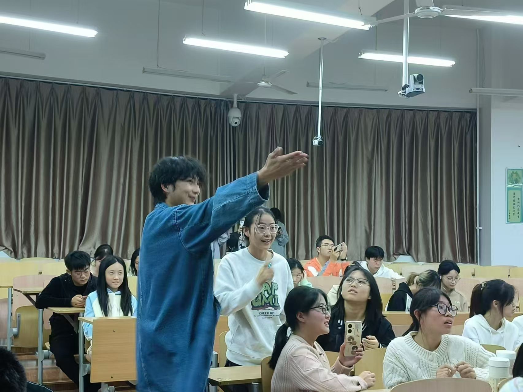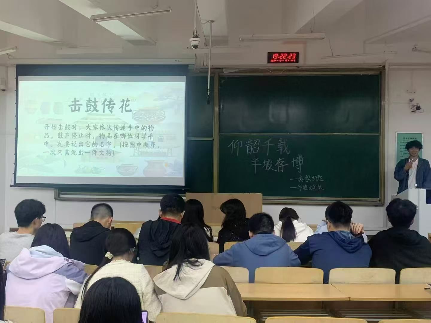 在此次活动中,还开展了“击鼓传花”游戏,与同学进行PPT互动问答,对积极参与问答的同学送上礼品,半坡讲解者下台之后,由半坡成员对本次活动进行总结。最后,我们邀请同学们参加了半坡博物馆的讲解志愿者活动,对想了解相关事宜的同学们进行详细的解答。活动结束后,半坡义导队成员会对场地进行打扫。
