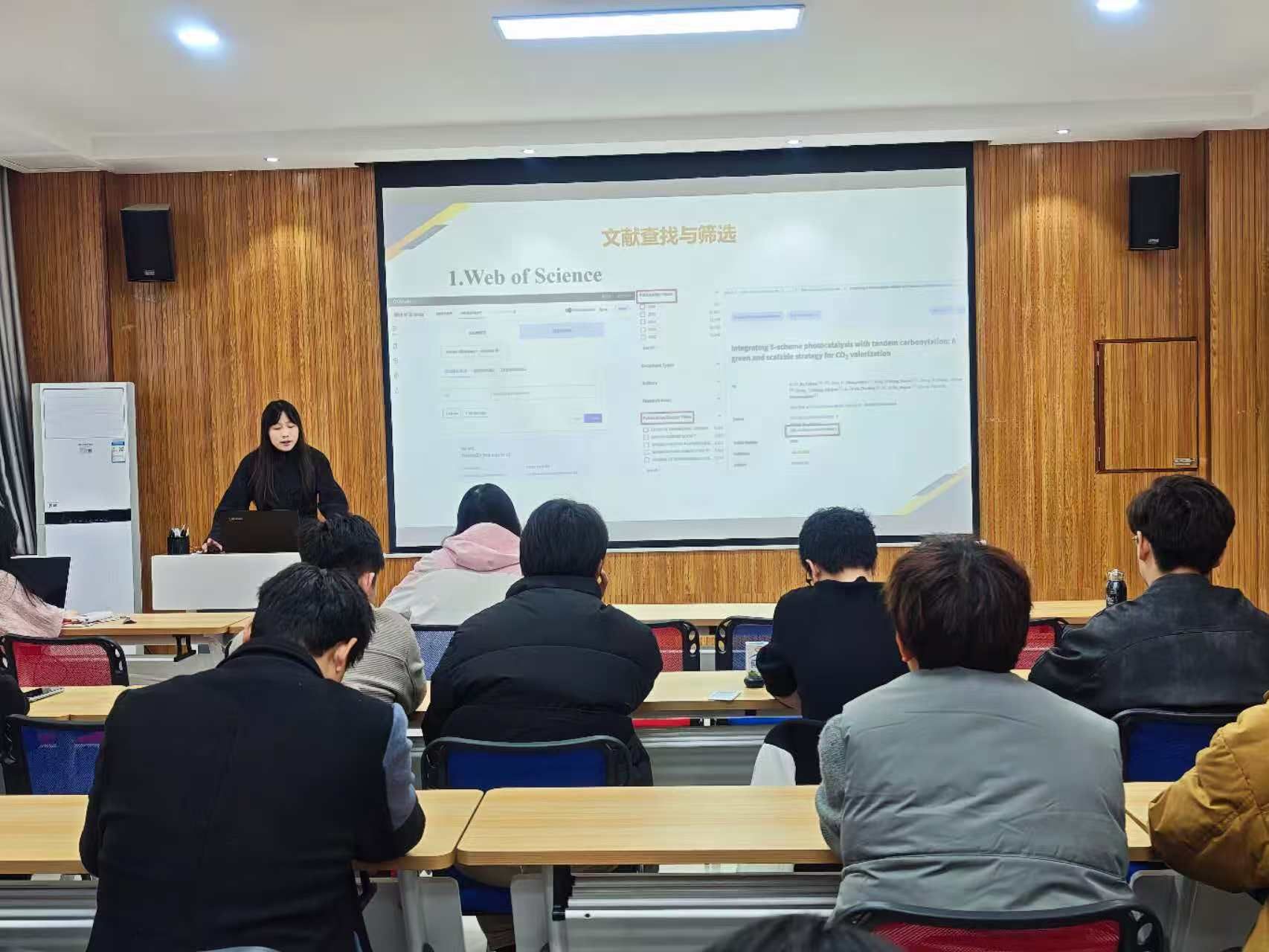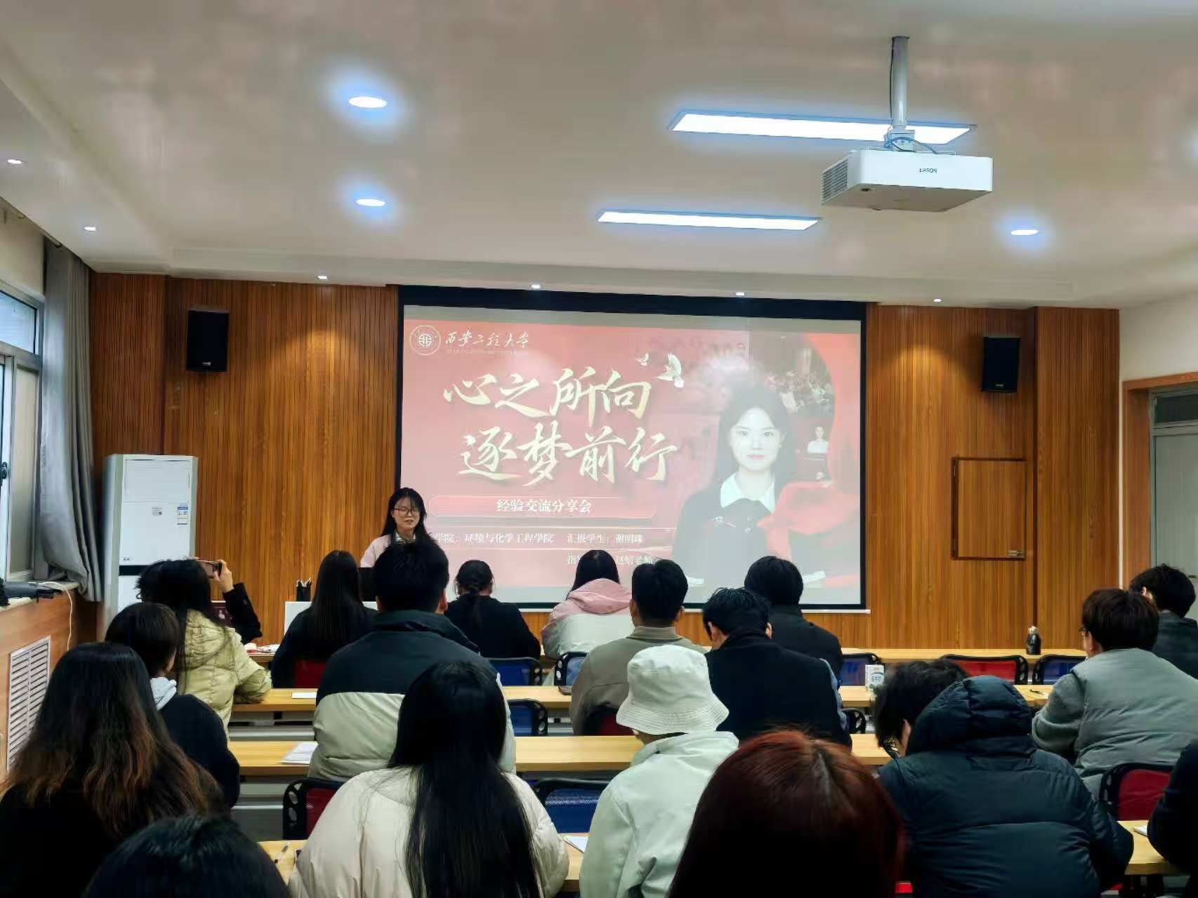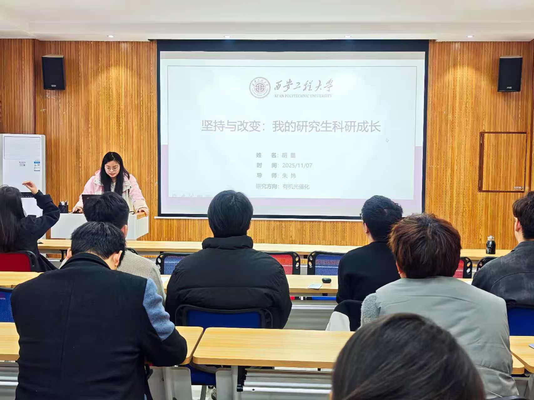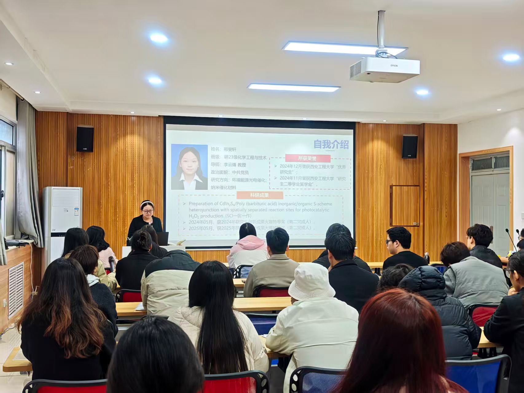 分享环节中,邢斐轩同学结合自身经历,介绍了高水平论文发表经验与参与创新成果大赛的的实战逻辑,鼓励大家要积极参与社会实践和科技赛事。谢明珠重点展示了其代表性科研成果,并分享了担任学院党建助理期间的心得体会,她强调,合理规划时间、适配学习方法,是平衡学业与工作的关键。王佳瑶以自己发表的论文为切入点,系统阐述了“研分三阶段”的成长规划与能力锻造路径,提醒同学们锚定目标、深耕专业、持续前行。胡苗同学则以其论文“三协同的废水处理材料创新”为例,分享了科研成果向实际应用转化的实践智慧与思考。