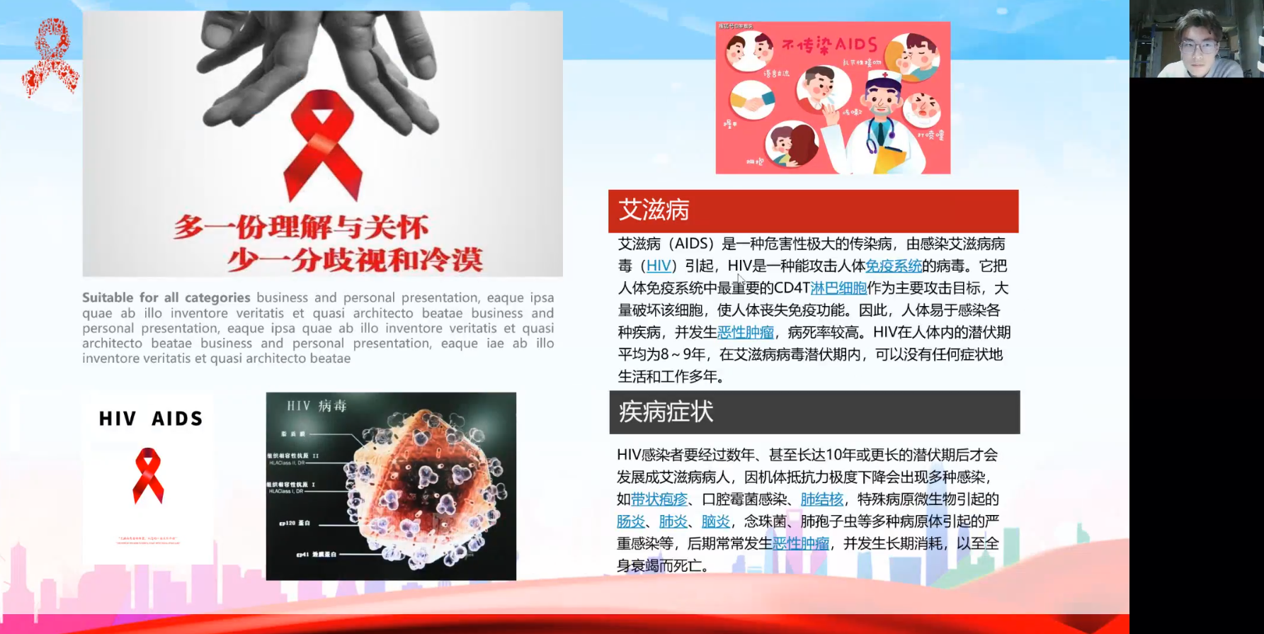 为进一步宣传、普及预防艾滋病的相关知识,提高同学们的防艾意识,营造关爱艾滋病人的氛围,我院各班于12月1日线上开展“关爱艾滋病人,共建美好家园”心理主题班会。