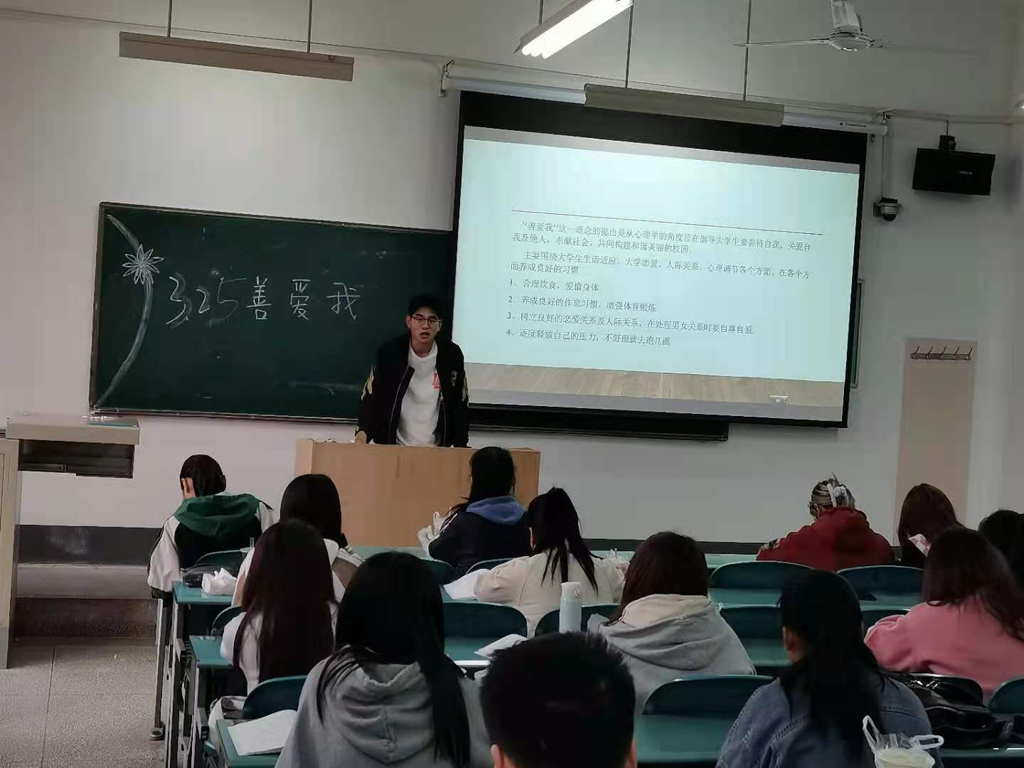 班会初始,张易泽结合班级实际情况对本次班会的目的和意义做出说明。通过讲解PPT让学生了解更多的心理健康知识,引导学生将心理健康知识掌握的更加全面,倡导同学们关爱自己,关心他人,遇到问题可到学校大学生心理健康教育中心寻求专业帮助。大学生只有学会了爱自己,才能懂得如何去爱别人、爱社会、爱国家,青年大学生是国家未来发展的关键力量,而心理健康发展首当其冲,维护好大学生的心理健康,才能成就国家的未来。
