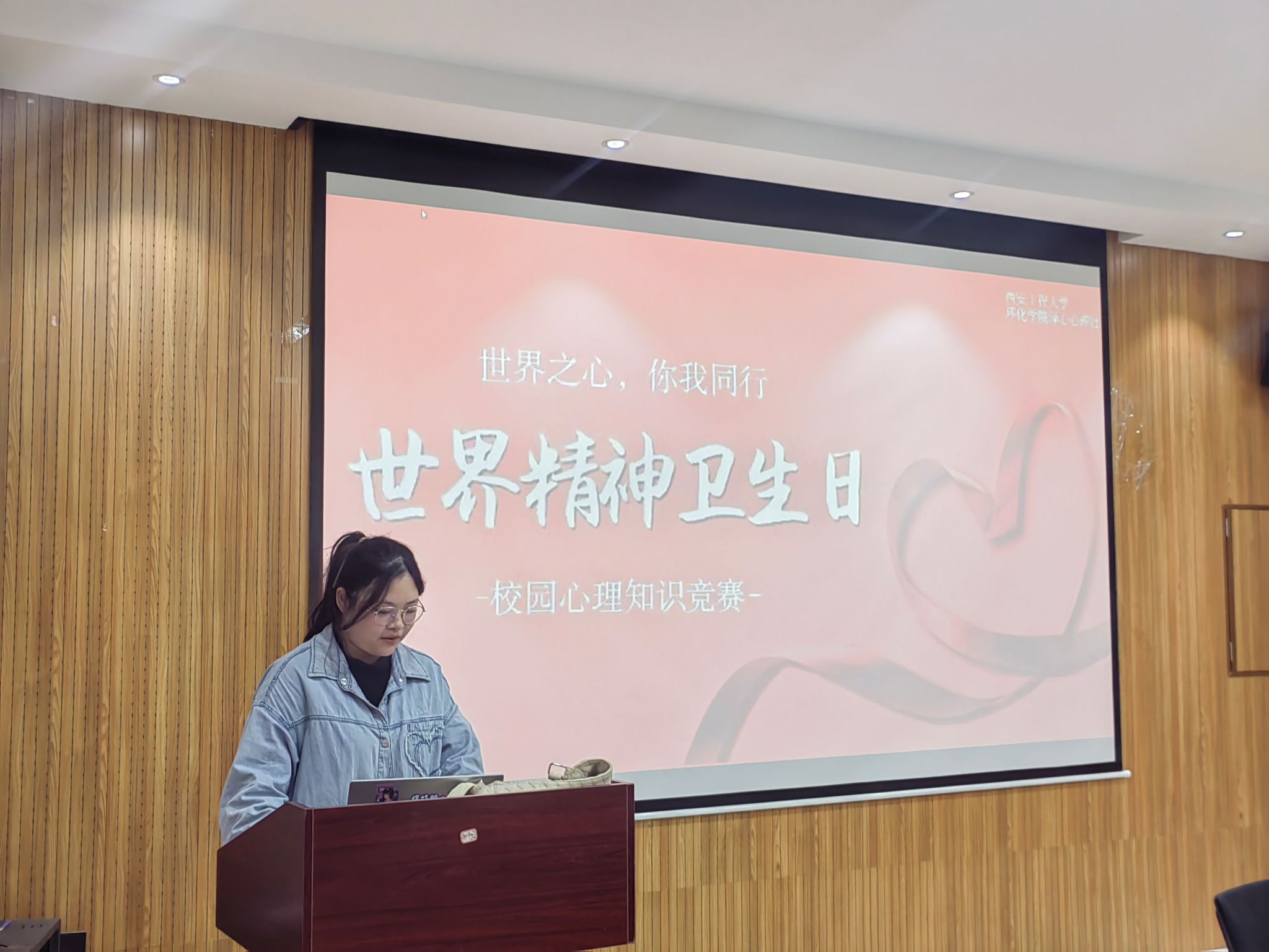 2023年10月8日至15日,为了向全校师生宣传精神卫生的重要性,普及心理健康知识,提高同学们的心理健康意识,引导广大同学关注精神卫生,保持心理健康和身体健康协调统一。故由校团委社团管理中心主办,译心心理社承办“世界之心,你我同行”活动。本次活动采用线下形式,面向188改名taptap全体学生进行知识竞赛。社长高乐洋及译心心理社社员参与主持活动。