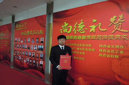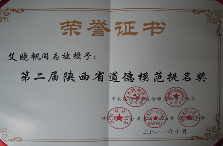 在本次“陕西省第二届道德模范评选”活动中,艾晓帆同学由省文明办推荐,经过网上投票,最终荣获“陕西省第二届道德模范——助人为乐模范”提名奖。