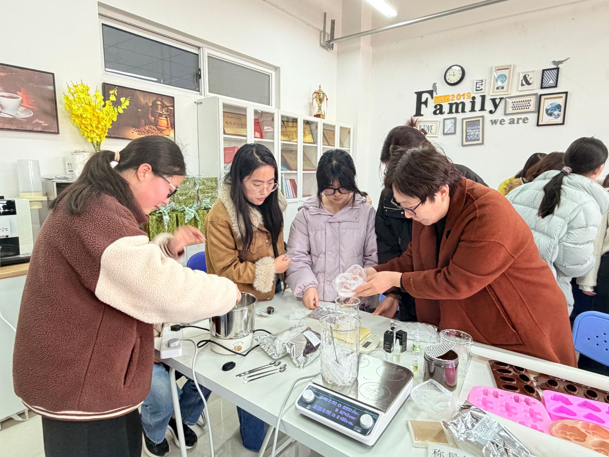 活动伊始,学院工会向全体女教工致以节日问候,这次活动既是对女性教职工的关怀,也是对学院“绿色化工”学科特色的生动诠释。希望大家在享受手工乐趣的同时,也能将环保理念融入日常生活。经过皂基融化、咖啡渣添加、精油调配、入模定型等步骤,一块块散发着咖啡醇香的环保香皂逐渐成型。活动现场还特别设置了咖啡知识小讲堂,让参与者在动手之余了解不同咖啡豆的特性和冲泡技巧。