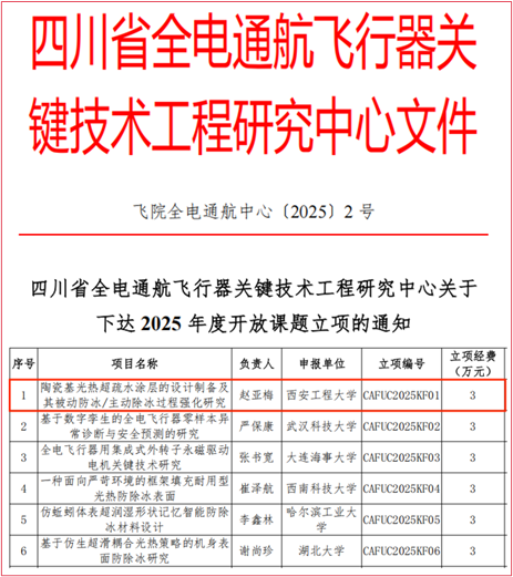 喜讯!我院赵亚梅教授牵头申报的开放基金项目《陶瓷基光热超疏水涂层的设计制备及其被动防冰/主动除冰过程强化研究》成功获批四川省全电通航飞行器关键技术工程研究中心开放课题立项。这是我校首次获批该中心开放课题,也是我院在有组织科研和学术生态建设方面取得的重要进展。