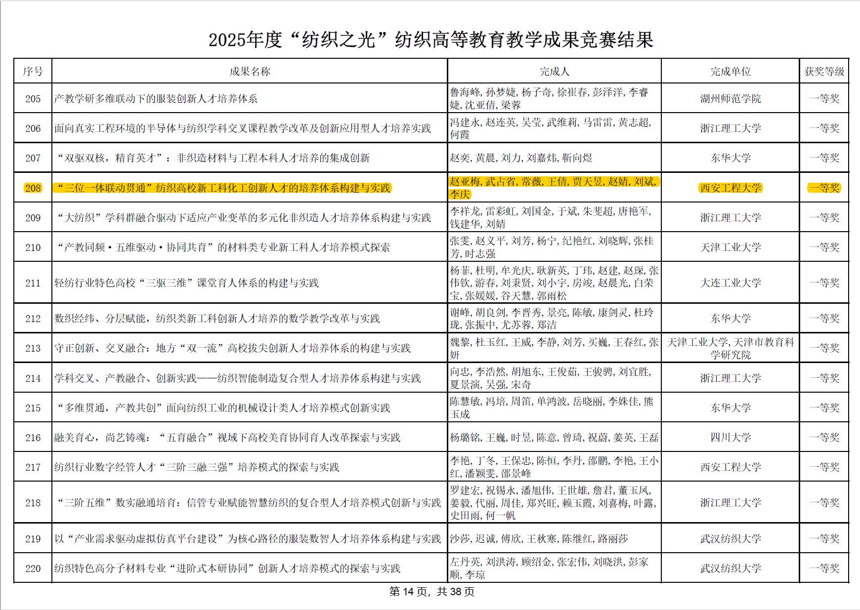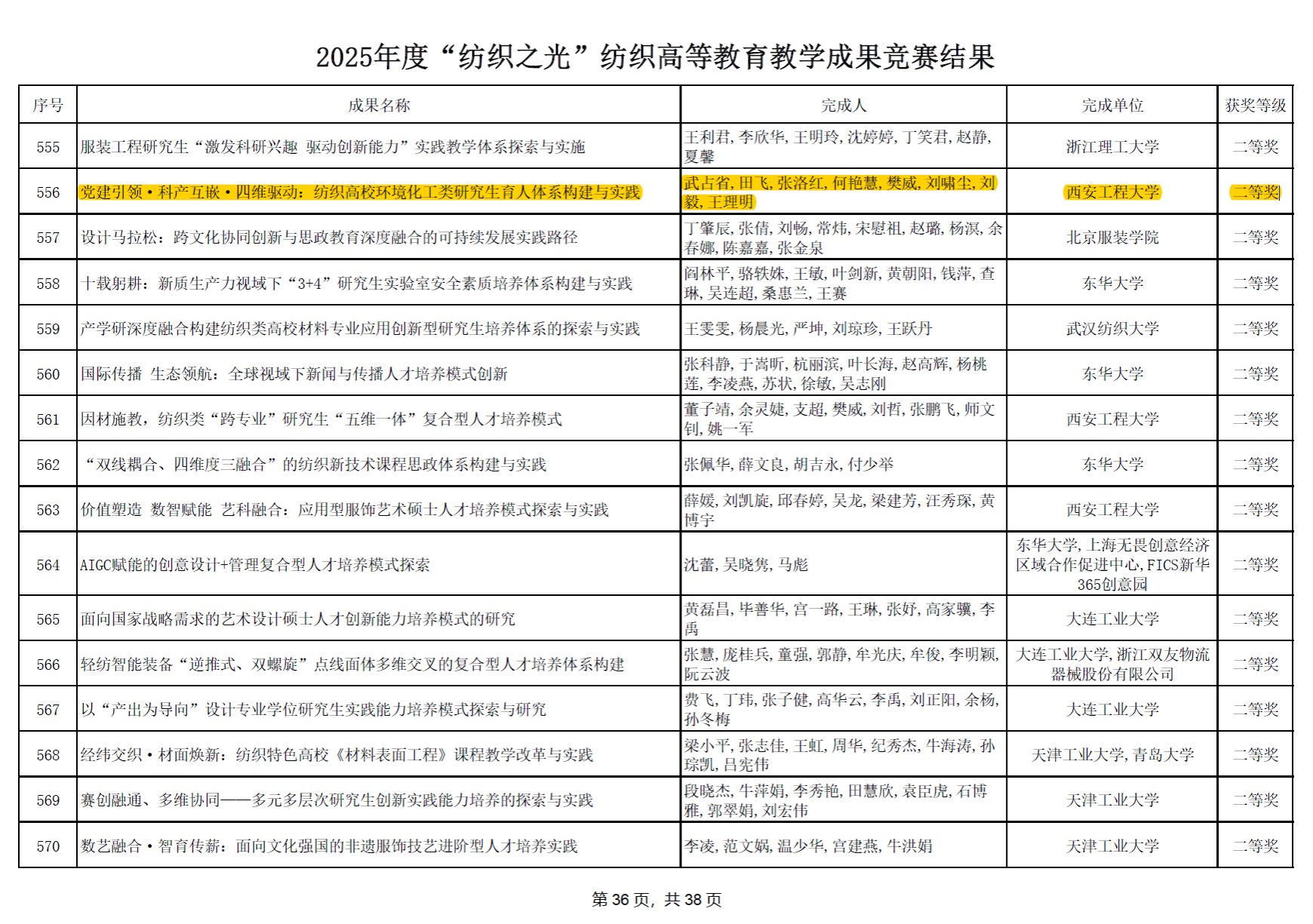 2025年9月10日,中国纺织服装教育学会公布了《关于公布2025年度“纺织之光”纺织高等教育教学成果竞赛结果的决定》,我院荣获2项纺织高等教育教学成果奖,其中一等奖1项,二等奖1项。