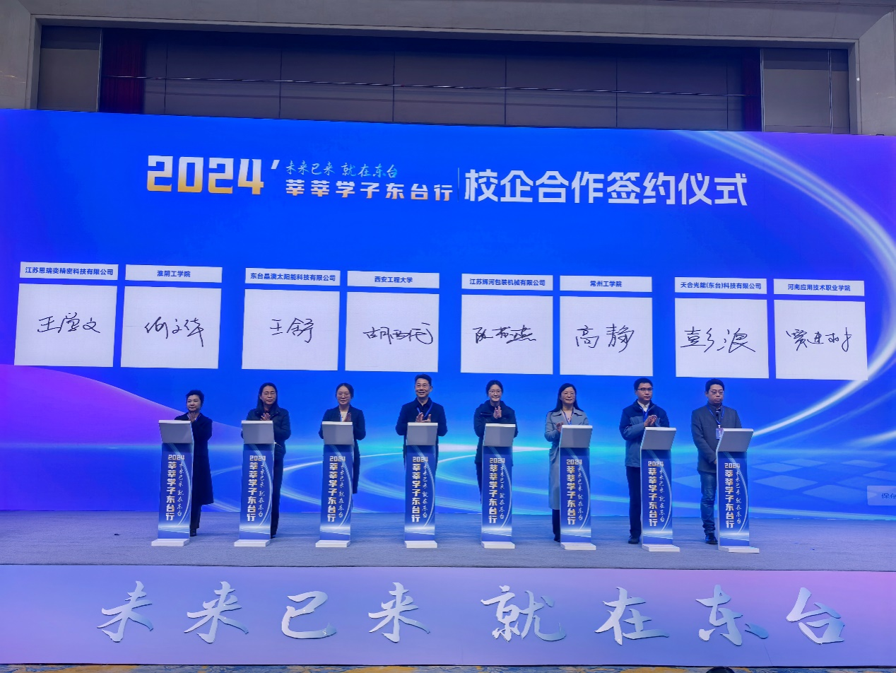 现场举行了引才工作站、引才大使、志愿者聘任仪式以及校企合作签约仪式。在校企合作签约仪式上,东台晶澳太阳能与我校签约合作,我院党委书记胡西民上台参加签约仪式。东台晶澳太阳能科技有限公司是晶澳太阳能科技股份有限公司壮大产业升级、提升发展动能的关键落子。东台晶澳致力打造国际领先、安全、优质、高效、低成本、数字化、人性化灯塔工厂。新上年产10GW光伏电池10GW光伏组件及配套项目,为2023年江苏省重大项目,占地面积880亩,建筑面积近50万平方米。公司5G全连接工厂建设项目入选2023年度江苏省5G工厂项目名单,创成盐城市(晶澳)光伏组件与电池工程技术研究中心。公司先后荣获江苏省工业信息安全防护星级企业、盐城市工业强市先进集体、盐城市三星工业企业、盐城市投入标兵企业、东台市制造业十强企业(集团)等19项荣誉称号。