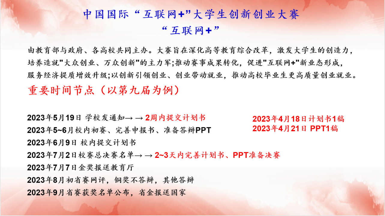 会上何艳慧老师分别以中国国际“互联网+”大学生创新创业大赛、“挑战杯”全国大学生课外学术科技作品竞赛和全国大学生创业计划竞赛作为重要学科竞赛的范例,进行了赛事的简介、具体要求和材料提交时间节点的详细介绍。